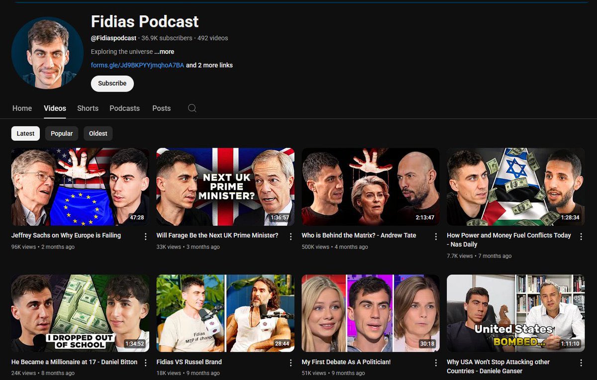 Gleichzeitig schmeichelte sich Fidias mit seinen Podcasts bei Kreml-freundlichen Propagandisten und gleichgesinnten Betrügern ein. Er führte extrem voreingenommene Diskussionen mit Vatniks wie Russell Brand, Jeffrey Sachs, Nigel Farage und Andrew Tate.