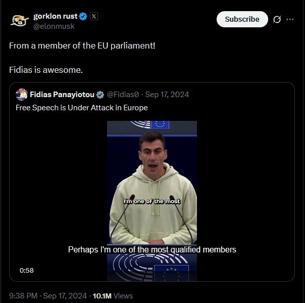 Fidias' Anti-EU-Haltung wird auch von seinem Kumpel Elon Musk geteilt. Sie haben ihre Ansichten über Technologiemoderation und „Freiheit” im Internet ausgetauscht. Elon hat sogar mal gefordert, Fidias zum „EU-Präsidenten” zu machen. Der totale Wahnsinn.