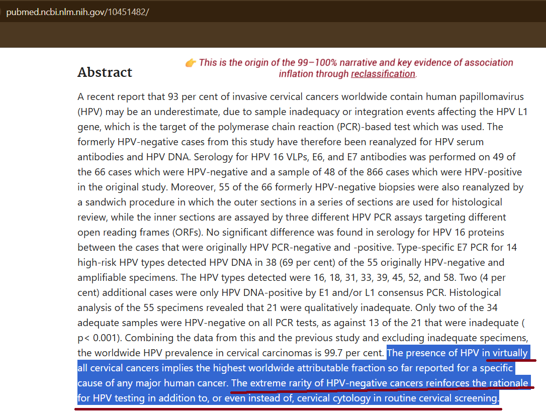 First, the HPV wasn’t even a “100% necessary cause” of cervical cancer, to begin with. The claim was manufactured over time—via spurious methods, meta-analyses, funding, and propaganda.