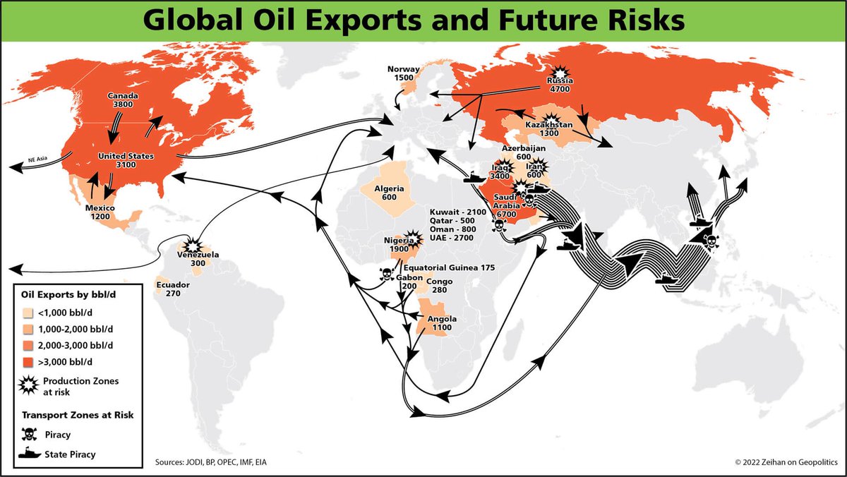Entre les 2 le transport se fait par supertankers. Generalement VLCC/Suezmax. Transport qui a une latence. Ce qui veut dire que les tankers qui arrivent en Europe aujourd’hui ont été chargés il ya 3/4 semaines dans le golfe persique. Et donc dans 2 semaines… n’arriveront plus