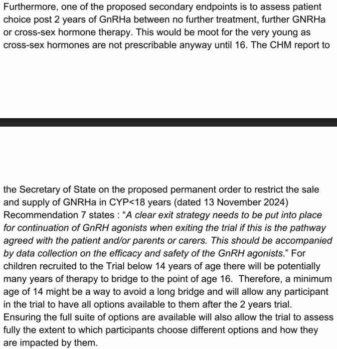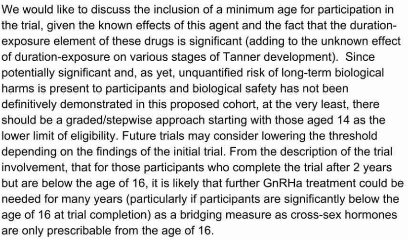 Finally, were the pause to be made permanent (after consultation), it has profound implications for any future trial of puberty blockers. The MHRA's recent request for a minimum age of 14, was in part because of fears of being on PBs for too long before hormones were available