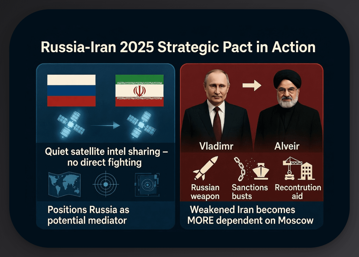 Russia-Iran 2025 strategic pact in action: Moscow quietly shares intel (satellites) without direct fighting. This positions Russia as a potential mediator for the conflict. A weakened Iran becomes more dependent on Russian weapons, sanctions-busting, and reconstruction aid. ๐ฐ๏ธ