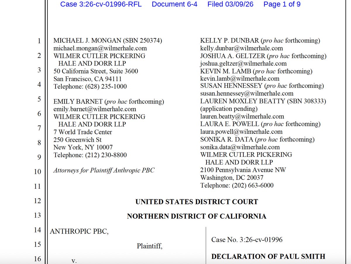 This declaration from Paul Smith, Anthropic’s CCO, gives the flavor. The dispute is over autonomous lethal weapons & mass surveillance of US citizens. Yet the govt is sabotaging Anthropic's contracts with grocery chains, pharma, financial services, fintech ... 2/3