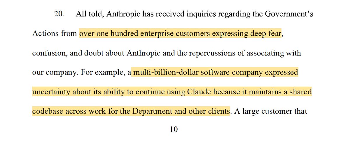 said that a fintech company cut a contract from $10M to $5M and that universities & business-to-business companies have switched to other providers. Said govt is affirmatively reaching out to their customers & urging them to stop working with Anthropic. They fear an executive order may soon target them ...