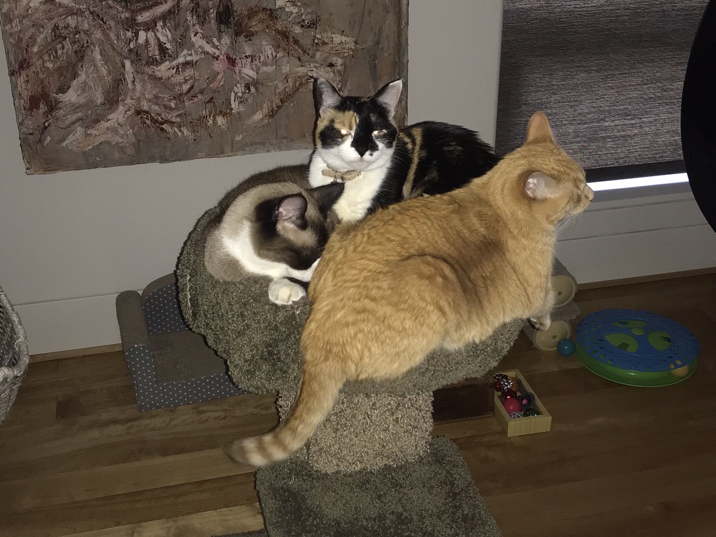 My days were spent researching, Bitcoin mostly. But once I had learned to curry their presence and favor, my new friends began forming up each night to call me to bed. We termed this our "Ménage-à-CATre".