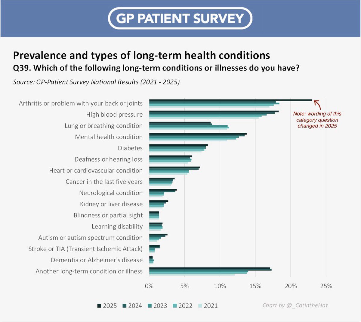 Now let’s dig a little deeper into the GP-Patient survey and look at which *specific* long-term health conditions have seen the biggest increases.