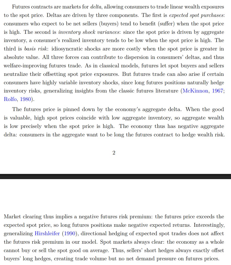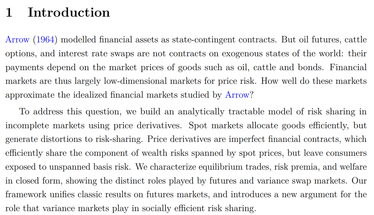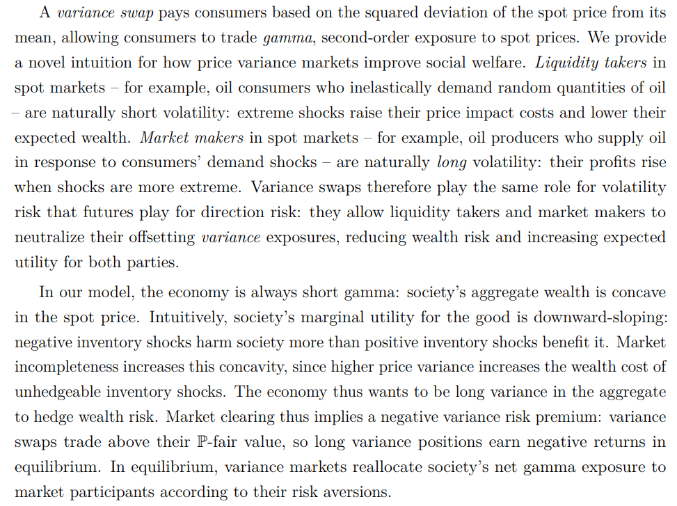 The study of price-linked contracts links nicely to Black-Scholes theory: it turns out price-risk markets are markets for Greeks. Agents have linear (delta) and quadratic (gamma) exposure to spot prices; futures trade the linear component, variance swaps the quadratic part