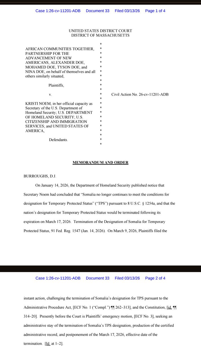 Can President Trump end *Temporary* Protected Status for Somalians on March 17? No says Judge Burroughs (Obama, D. Mass). Why? Ending TPS would be a big deal with big implications. No discussion of the preliminary injunction or stay factors. Just a presumption against regularity.