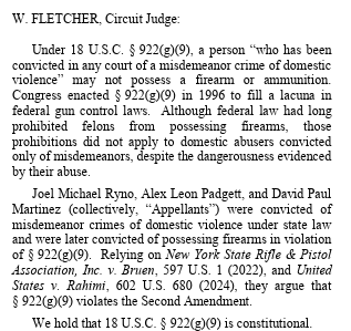 Can the federal government prohibit convicted domestic violence misdemeanants from having guns? A unanimous Ninth Circuit panel says: Yes, both facially and categorically as applied. Interesting move treating the as-applied as covered by the facial validity of the law.