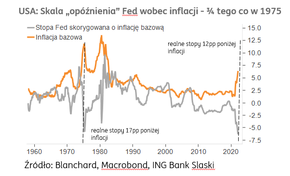 (2) Obawiamy się, że stopy Fed mogą wzrosnąć powyżej obecnie wycenianych przez rynek. Dzisiaj rozbieżność inflacji bazowej oraz realnych stóp Fed osiągnęła aż 3/4 tego co w latach 70-tych. Proste kalki są nieuzasadnione, nastąpiły duże zmiany. 2/9