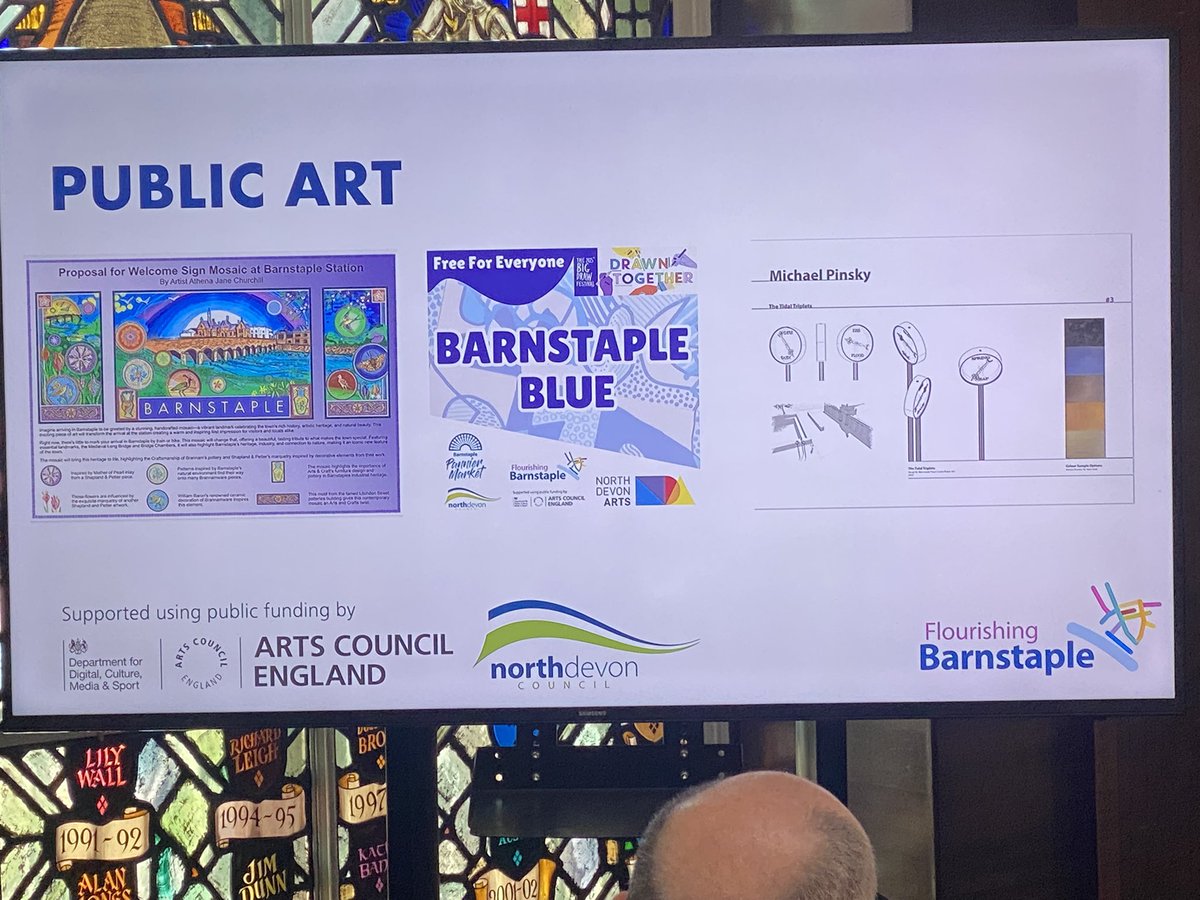 Afternoon kicking off with a couple more lightning talks - Barnstaple. Heritage Open Days mentioned as one of successful activities happening when project began - to be embraced. Worked with local businesses - support for basic skills, public art as well as capital project.