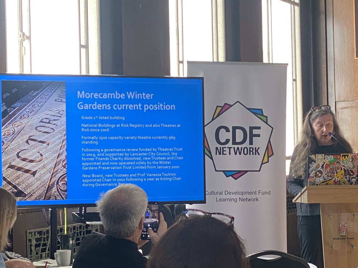 Next lightening talk: Morecambe Winter Gardens - the ‘Albert Hall of the north’. Often buildings are saved before a plan for what you do with it is properly formed. 11 different grants. Local people behind this & believing in the building. Critical CDF includes capital & revenue.