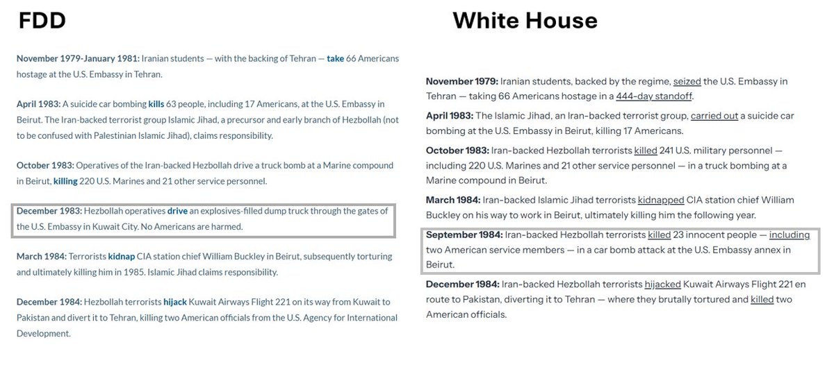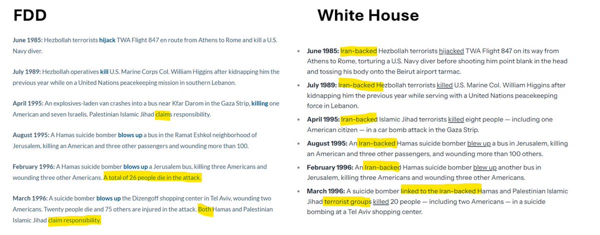 3/ the next six incidents match in both FDD and White House lists. The White House version adds "Iran-backed" in all six lists and made a firm attribution where FDD had noted "claimed responsibility".