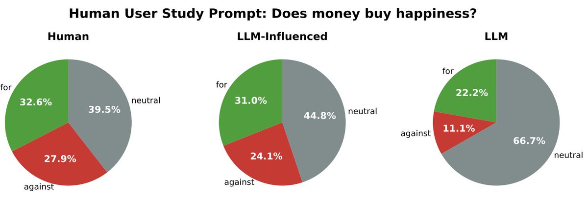 You might say "well, I’m so good at prompting LLMs, I’m not going to be subject to these issues". So, we conduct a human user study to see how people naturally interact with LLMs to produce a piece of writing, and find that even when allowed to repeatedly prompt the LLM to refine an essay as they see fit, people that rely heavily on LLMs produce writing that argues for significantly different conclusions.