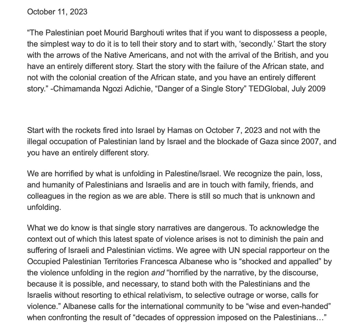 @jessicaschwalb7 Four days after Oct. 7, Moore and Rashid coauthored a statement urging students to “challenge single story narratives that justify vengeance and retaliation.”