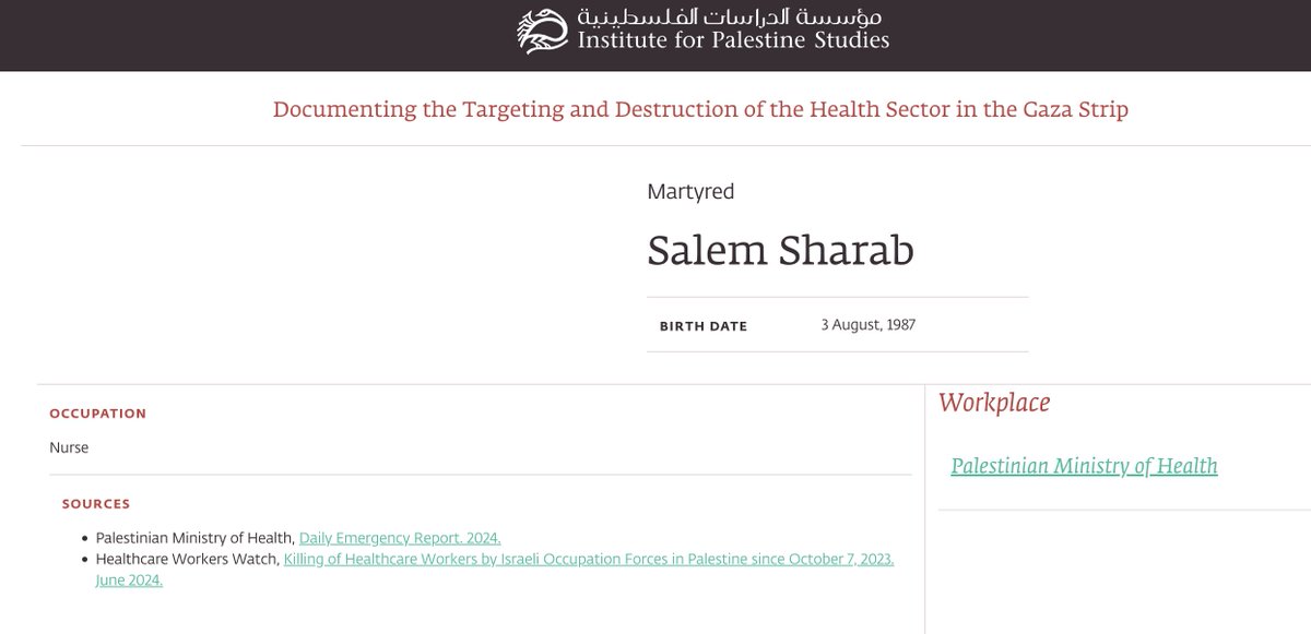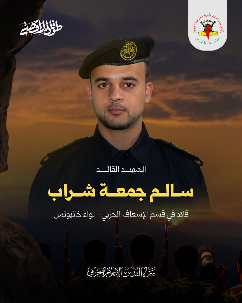Salem Juma Ishaq Sharab (ID #: 801710096, age 36), a nurse at Nasser Hospital and treasurer of the Palestinian Nursing Association, was a commander in PIJ’s Military Ambulance Unit in the Khan Younis Brigade. Sharab was killed in a March 2024 airstrike near the Emirates Hospital in Rafah.