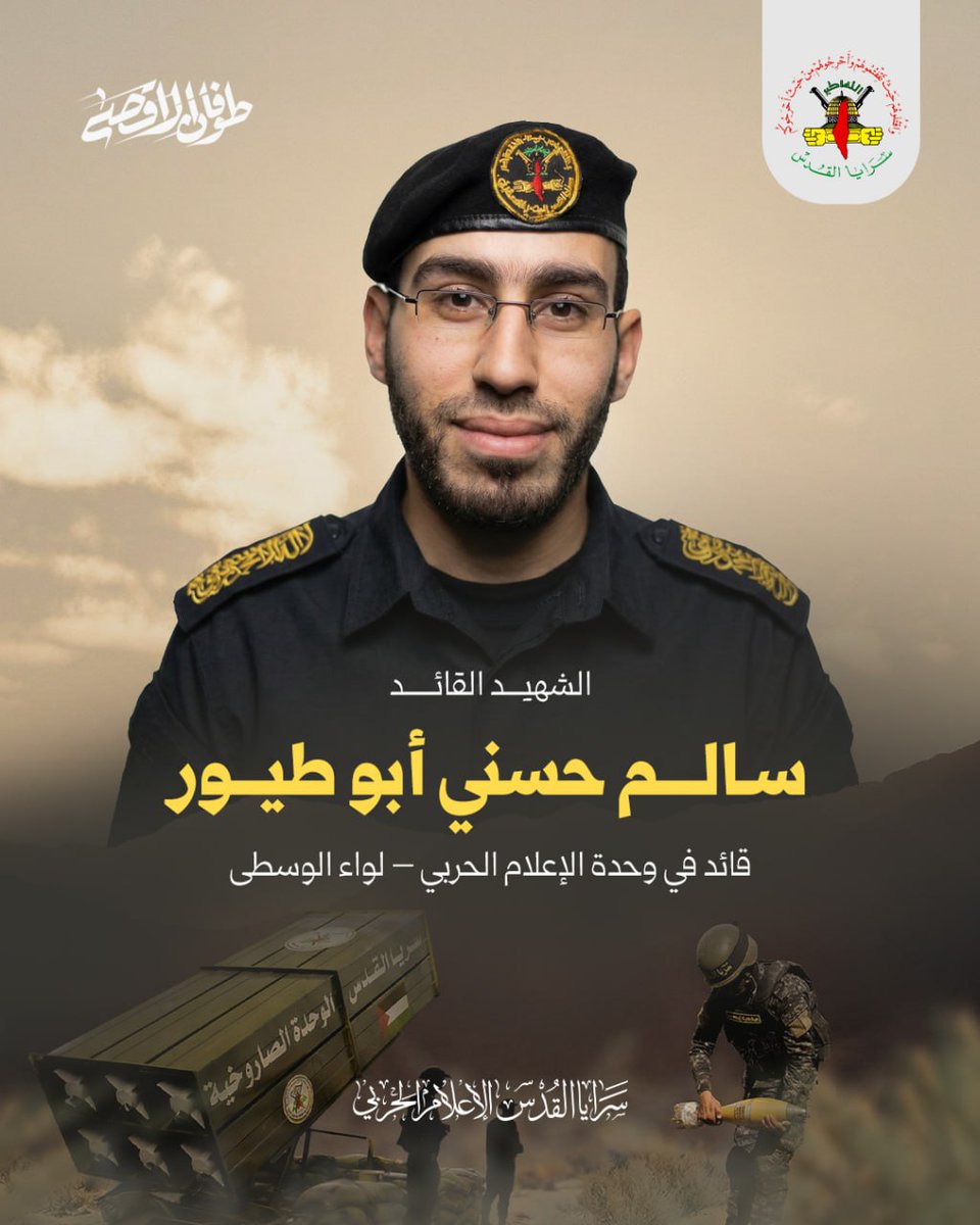 Salem Hosni Salem Abu Tayr (ID#: 802466995, age 34), listed as the financial manager of and photojournalist for the PIJ-affiliated al-Quds Today TV, was confirmed to be a commander in PIJ’s Military Media Unit in the Central Brigade. According to family members, Abu Tayr initially trained as a nurse. Abu Tayr was killed in an April 2024 airstrike.