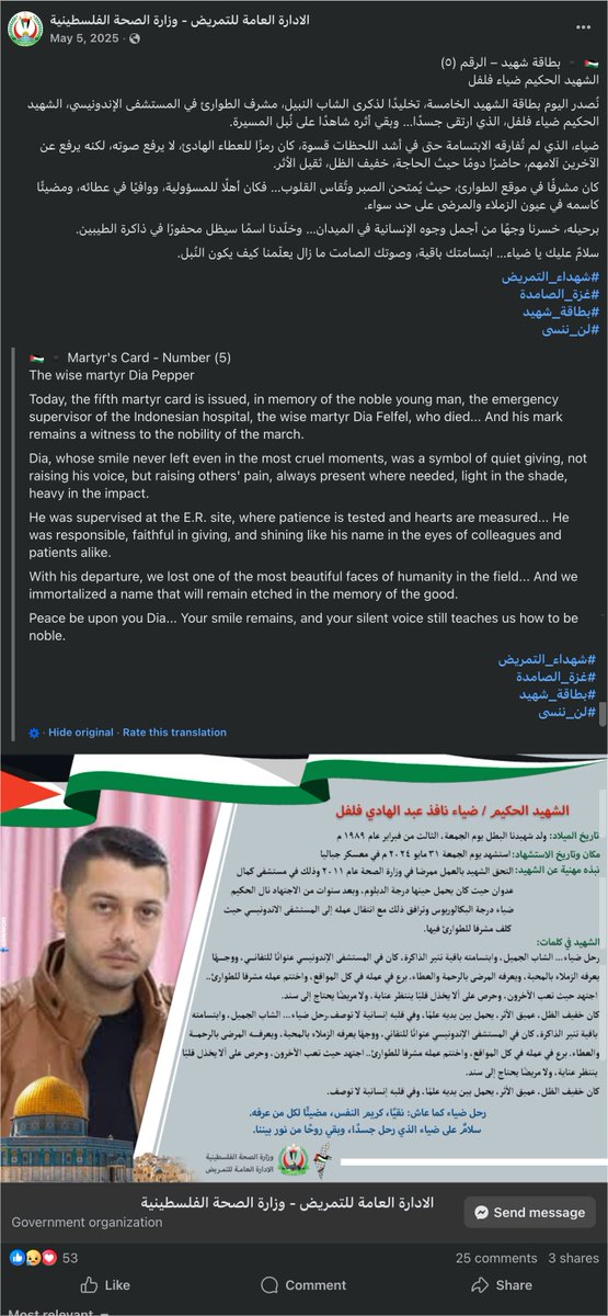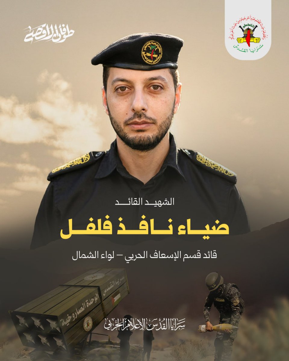 Diaa Nafez Abdulhadi Felfel (ID#: 802233486, age 35), who worked both as a nurse and the emergency room supervisor for the Indonesian Hospital in north Gaza, was a commander in PIJ’s Military Ambulance Unit in its Northern Brigade. Felfel was killed in a May 2024 airstrike.