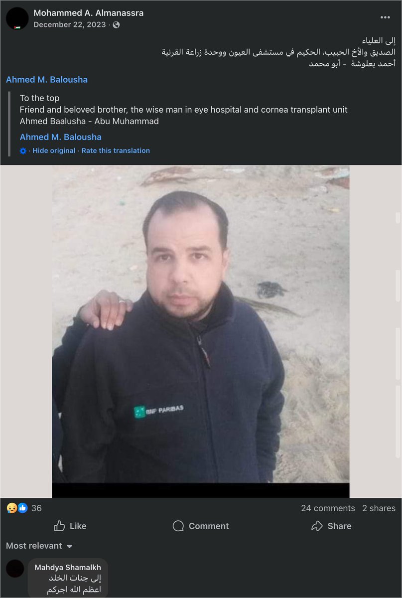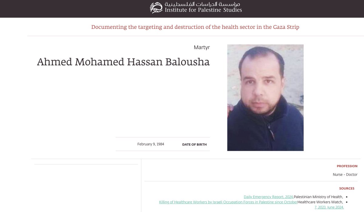 Ahmed Mohammed Hassan Balousha (ID#: 800114175, age 39), a nurse who a colleague said worked in a corneal transplant unit at the Eye Hospital in Gaza City, was a commander in PIJ’s Military Judiciary Unit in the Gaza Brigade. Balousha was killed in a December 2023 airstrike.