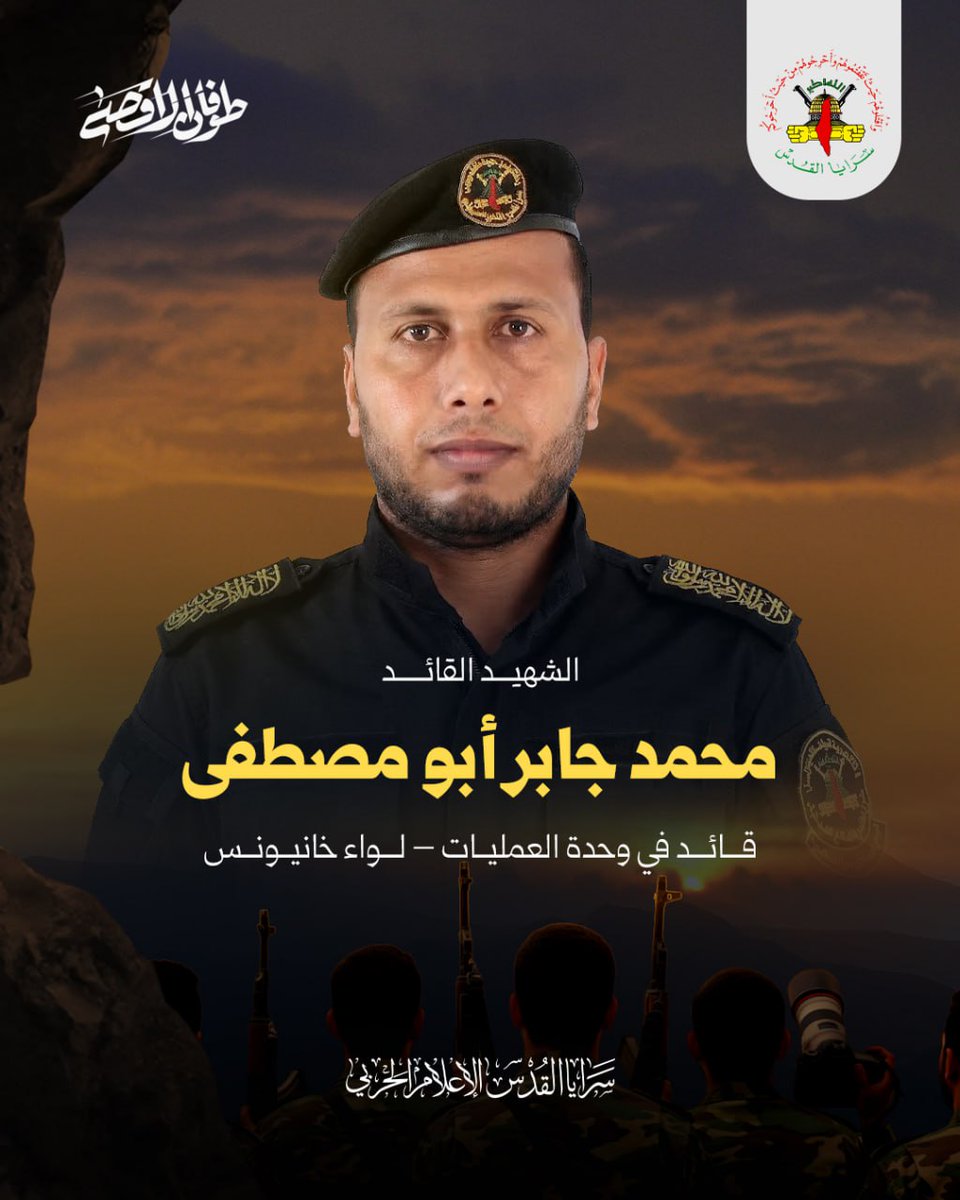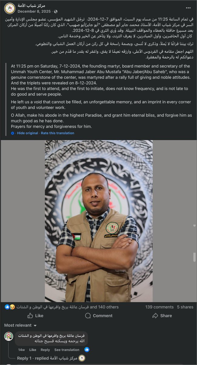 Mohammed Jaber Dakhlallah Abu Mustafa (ID#: 800355760, age 38), founder and executive director of the National Youth Center NGO in Khan Younis, was a commander in the Operations Unit of PIJ’s Khan Younis Brigade. Abu Mustafa was killed in a December 2024 airstrike.