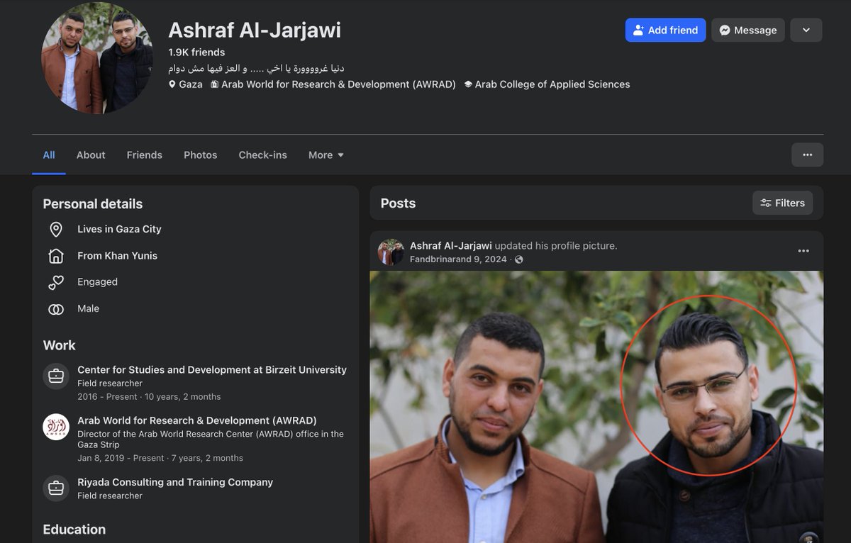 Arafat Abullah Mohammed al-Jarjawi (ID#: 801948613, age 35) was the Deputy Commander of the al-Ourubi Battalion in PIJ’s Khan Younis Brigade. His brother Ashraf al-Jarjawi (circled) is reportedly the Gaza director of the Arab World Research and Development Center (AWRAD), which carries out polling in the strip.