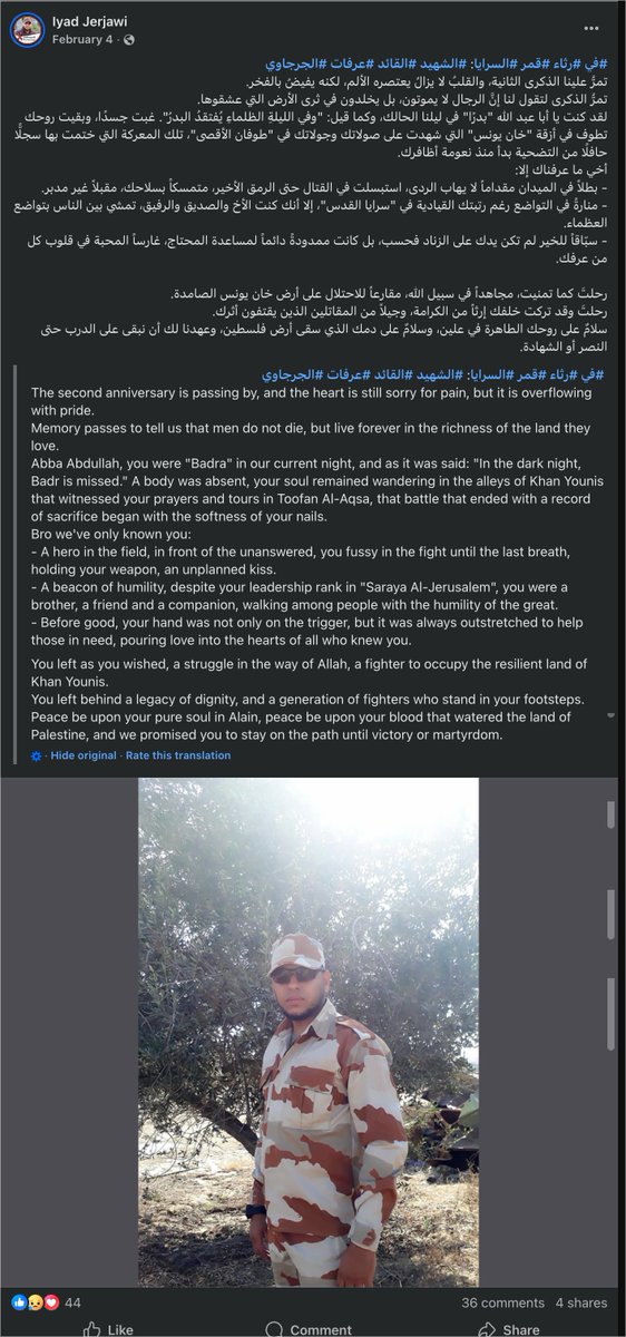 Munir Attia Darwish al-Adini (ID#: 800137549, age 40) was a commander in PIJ’s military manufacturing unit. Both he and his wife, prominent Palestinian journalist Wafa Ali Abdrabbo al-Adini (ID#: 801342437, age 38), along with two of their children, were killed in a September 2024 airstrike. This thread has more details: