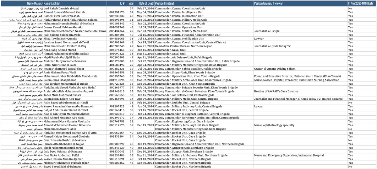 While the U.S.-Israel-Iran conflict dominated the news, PIJ released another list of 20 commanders killed during the war in Gaza on March 1. They include the husband of a prominent journalist and an ICU nurse, and 17/20 can be found on the Gaza Health Ministry list. 🧵