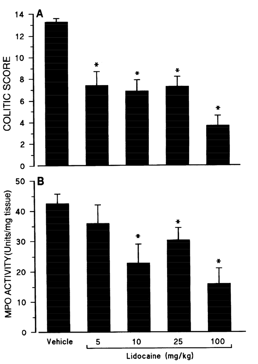"Lidocaine dose dependently reduced the severity of colitis and the infiltration of granulocytes at 24 h and 7 days post-TNBS."