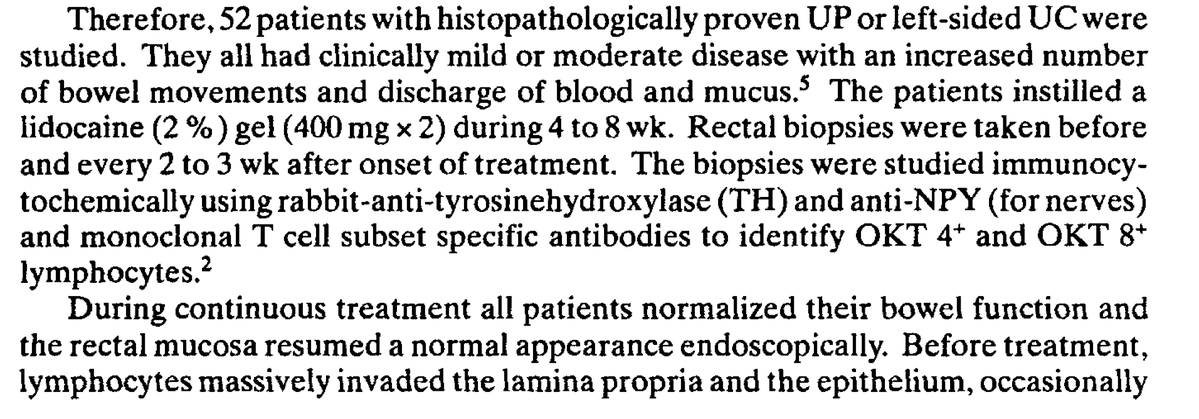 Topical treatment of the rectal mucosa with lidocaine in patients with UC/UP resulted in rapid symptomatic relief, restored mucosal integrity, and caused extravasal lymphocytes to disappear.”