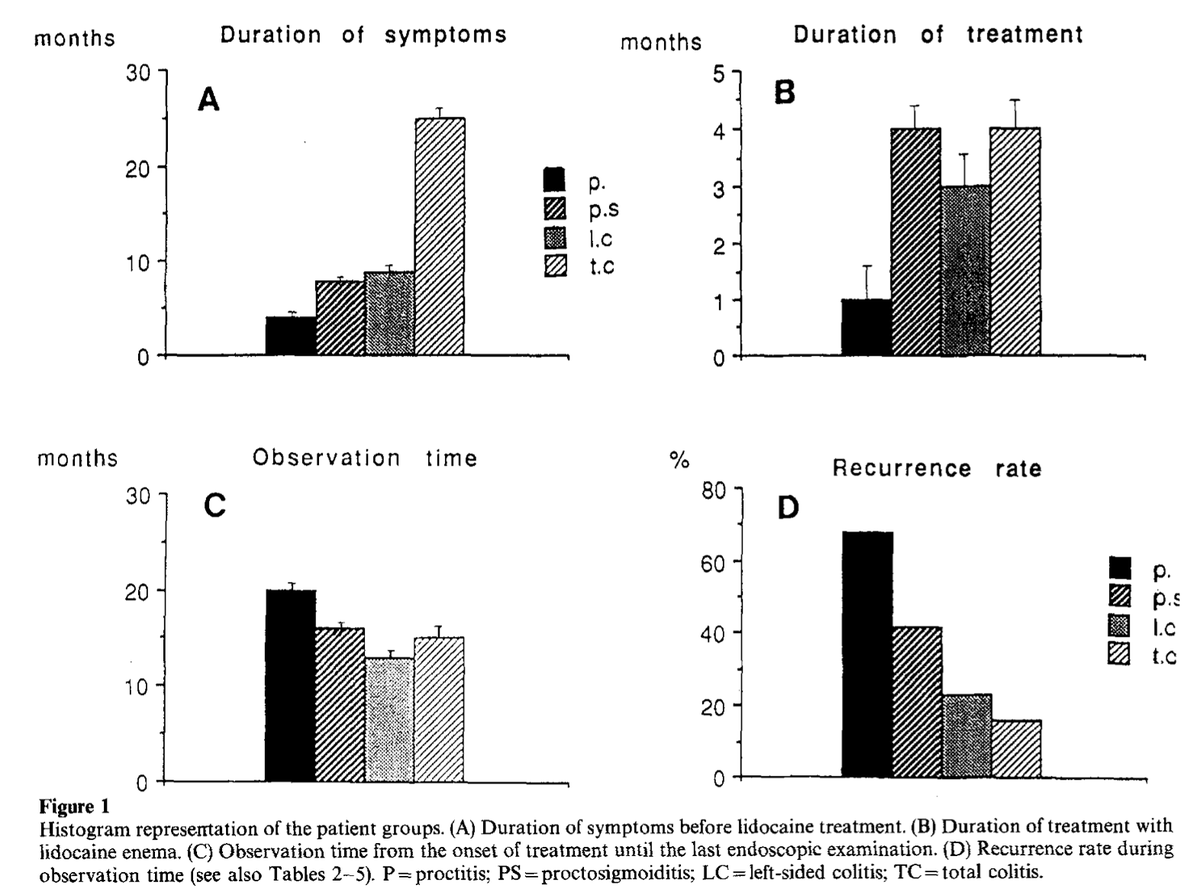 "The patients instilled a lidocaine (2 %) gel (400 mg × 2) during 4 to 8 wk. Rectal biopsies were taken before and every 2 to 3 wk after onset of treatment."