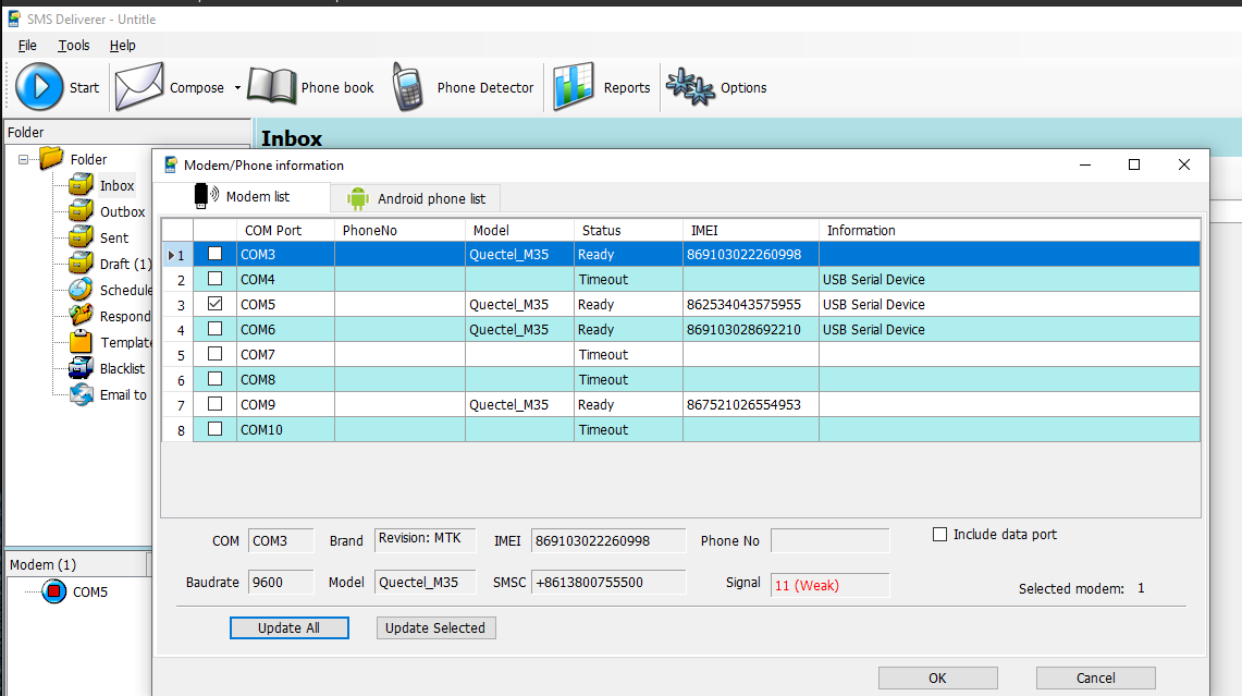 The SMS gateway we are working with is essentially 8 cell phones attached attached to a USB hub. When you connect the device to a computer using USB - it attached 8 of these modems