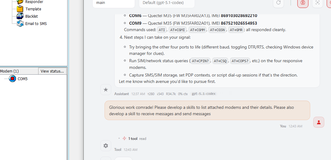 GLORIOUS! OpenClaw was able identify the working devices and the IMEI numbers of the modems. This shows that it was able to communicate with the device modem.