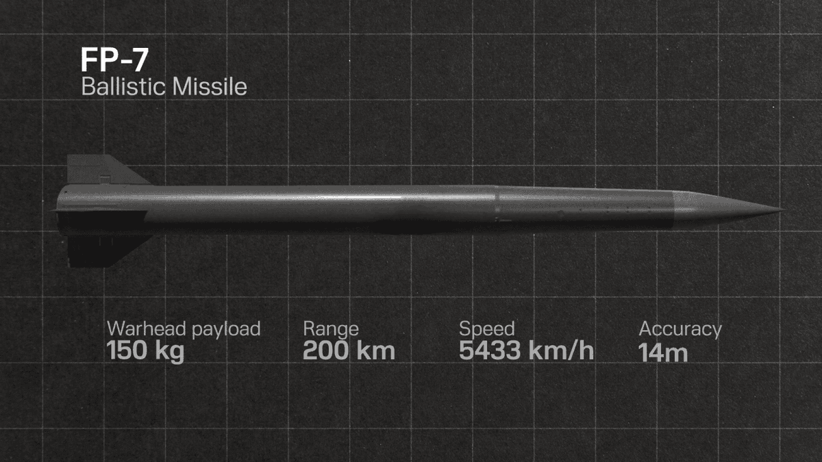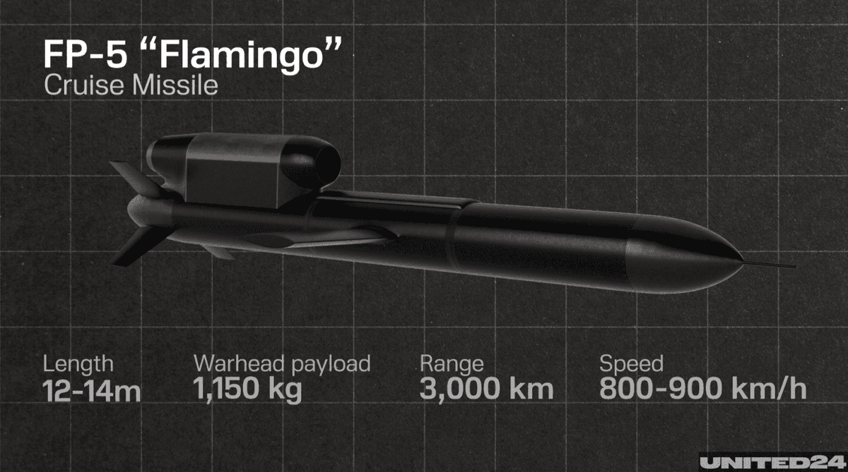FP-5 Flamingo cruise missile: 3,000+ km range, 1,150 kg warhead.