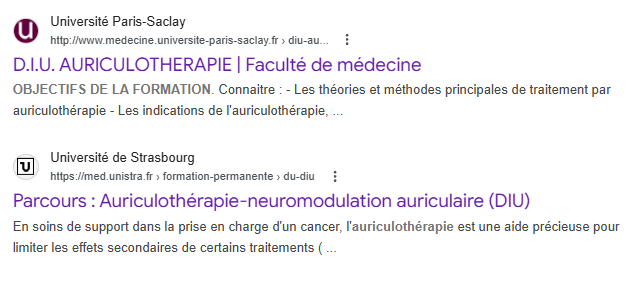 @MathieuMolimard @ConfDoyensMed 7/ J'ai pris 10 secondes Google, je dis bien 10 secondes, et j'ai déjà trouvé deux diplômes universitaires d'auriculothérapie délivrés par des facs de médecine (évidemment il y a Strasbourg dedans, et aussi Paris-Saclay qui ne supprime pas la thèse plagiée de Idriss Aberkane).🔽
