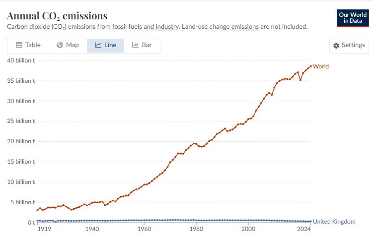 These supposed benefits assume massive global action — yet global emissions are still rising (up more in 2024 than the UK’s entire annual total). The UK is only ~0.8% of global emissions. Our efforts are a rounding error (11/13) Image