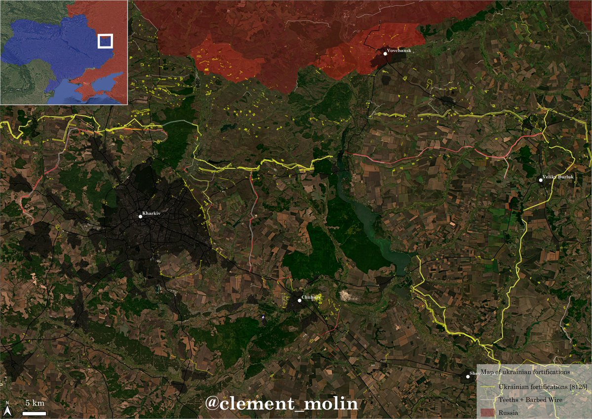 Furthur to the north, we can see new fortifications all around Kharkiv and east of the Donets river, around Veliky Burluk. A ring defensive line is also being prepared around Chuhuiv. Image