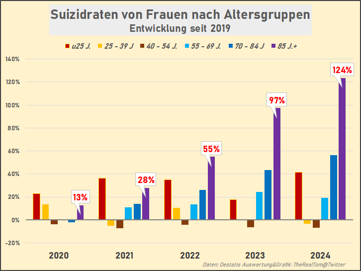 - Der Anteil von Frauen über 85 in ihrer Altersgruppe, die den Freitod wählen, hat sich mehr als verdoppelt.