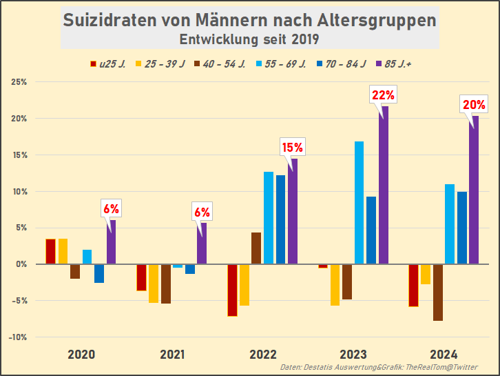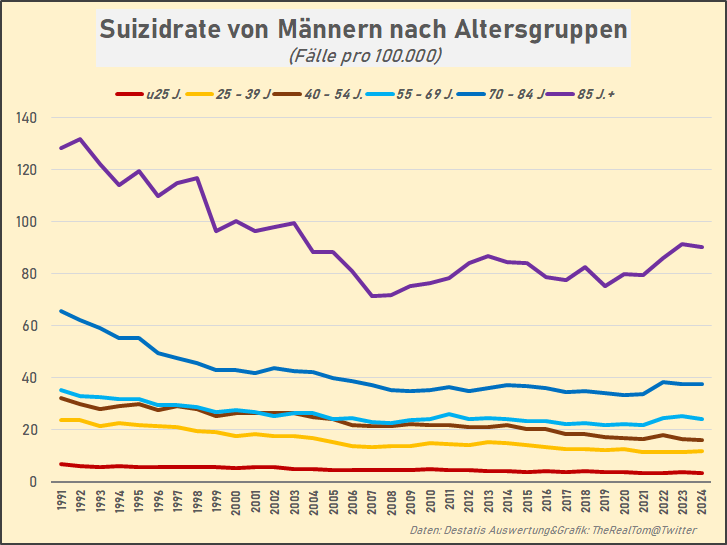 Die Gesamtzahl der Suizide lag 2024 bei 10.372, davon 71,5 Prozent Männer. Die Suizidrate von Männern ist über Jahrzehnte hinweg konstant 2,5 bis 3 mal höher als die von Frauen.