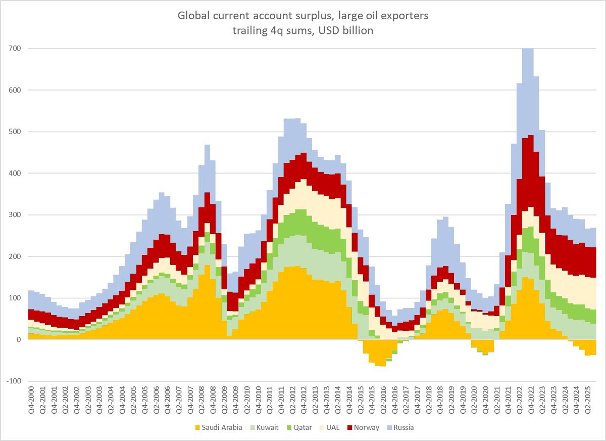 Saudi Arabia's external deficit offset Russia's surplus, so the two biggest oil exporters (~ 15mbd of exports together) were not generating petrodollars, petroeuros or petroyuan