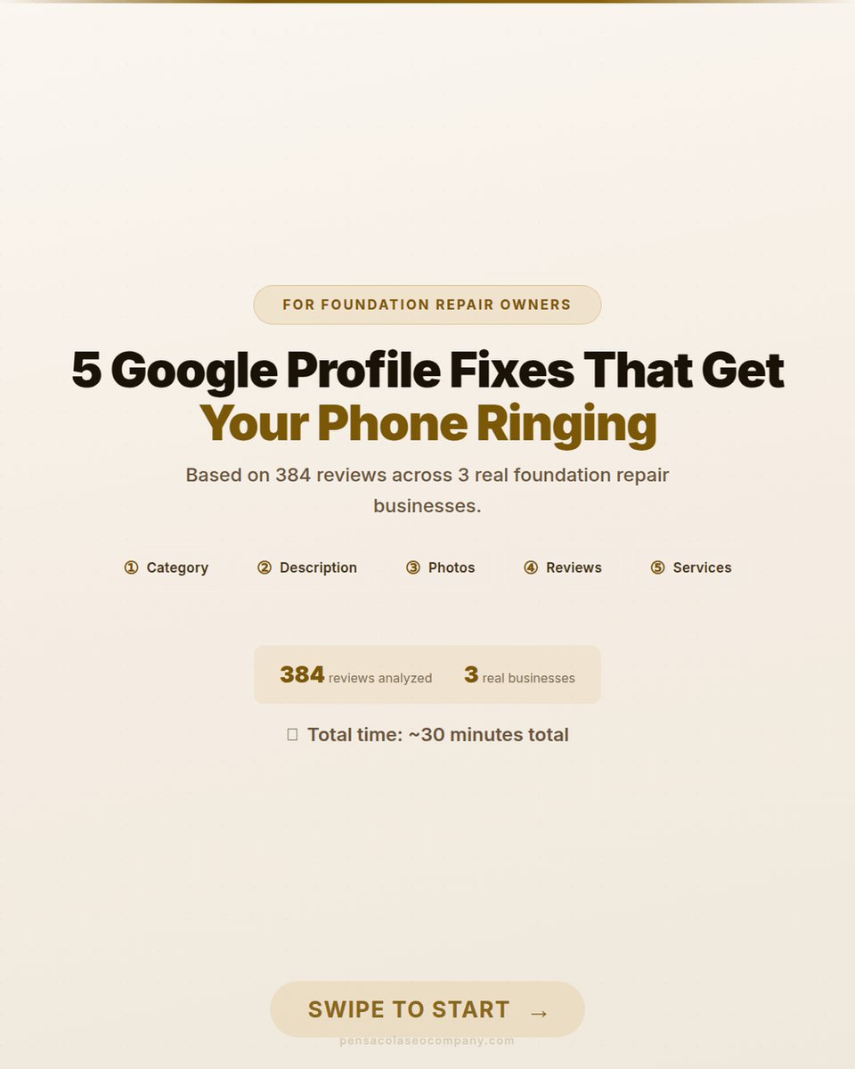 I analyzed 384 reviews across 3 real foundation repair businesses in Houston. Here are the 5 Google Profile fixes that take about 30 minutes total.