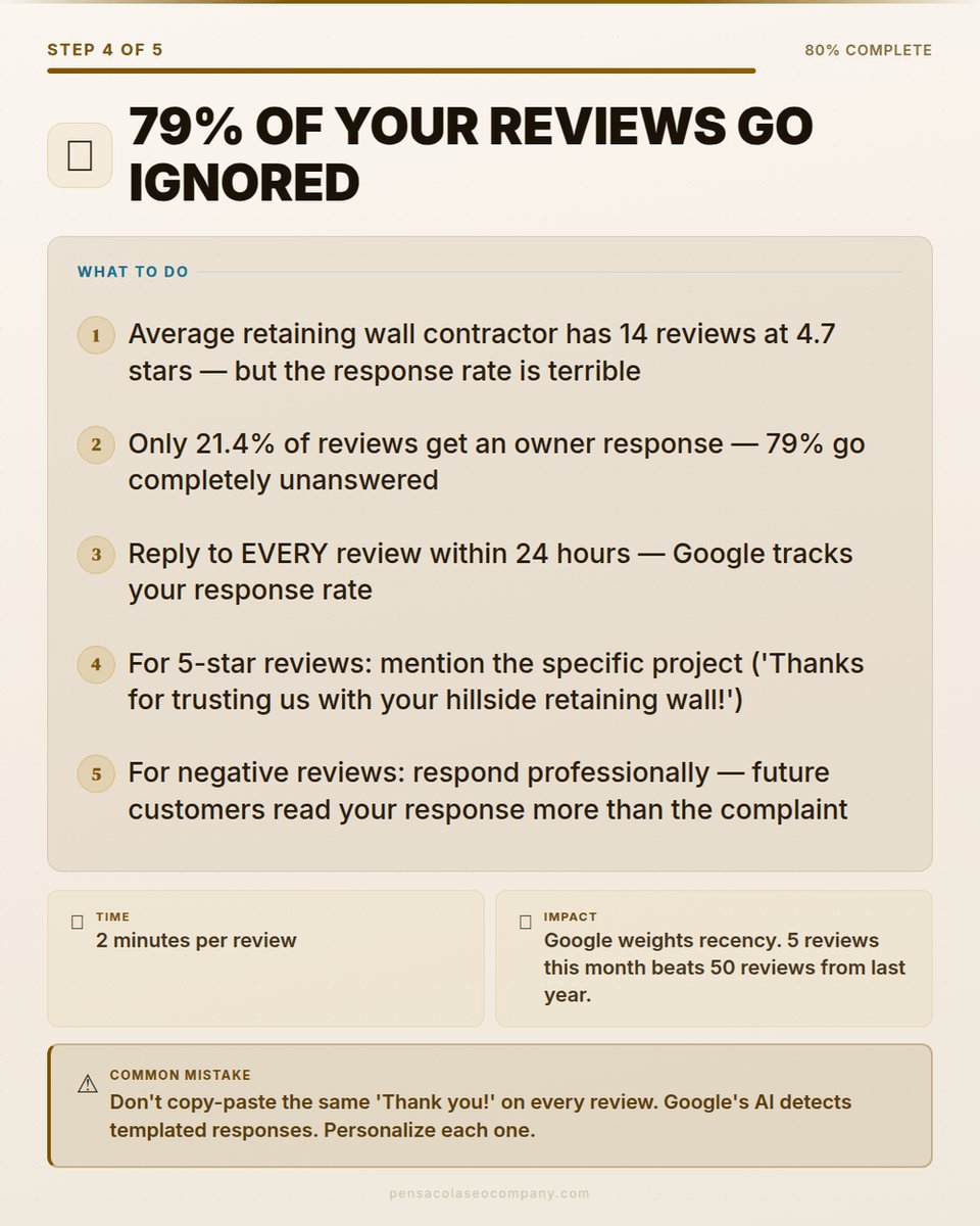I analyzed 28 reviews across 2 retaining wall businesses. 79% of their Google reviews go completely ignored ๐งต๐