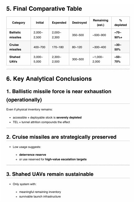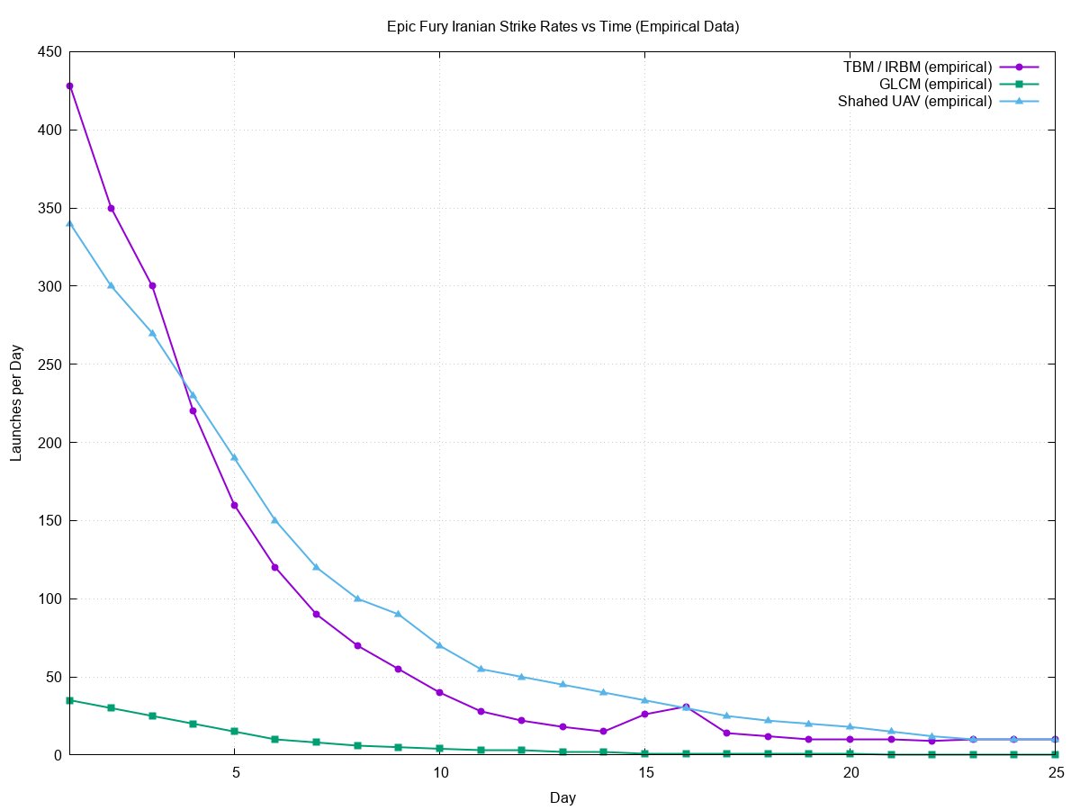 On the military front, these recent Iranian missile/drone launch depletion curves, using AI collected empirical data, shows TELs and munitions may still be squirreled away in dispersal sites, and some blocked tunnels may have been excavated.