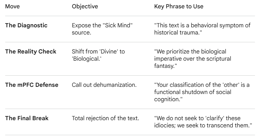 It codifies the transition from Scriptural Obscurantism to Rational Autonomy, providing a clinical and evolutionary framework for the total rejection of ancient dogmas.