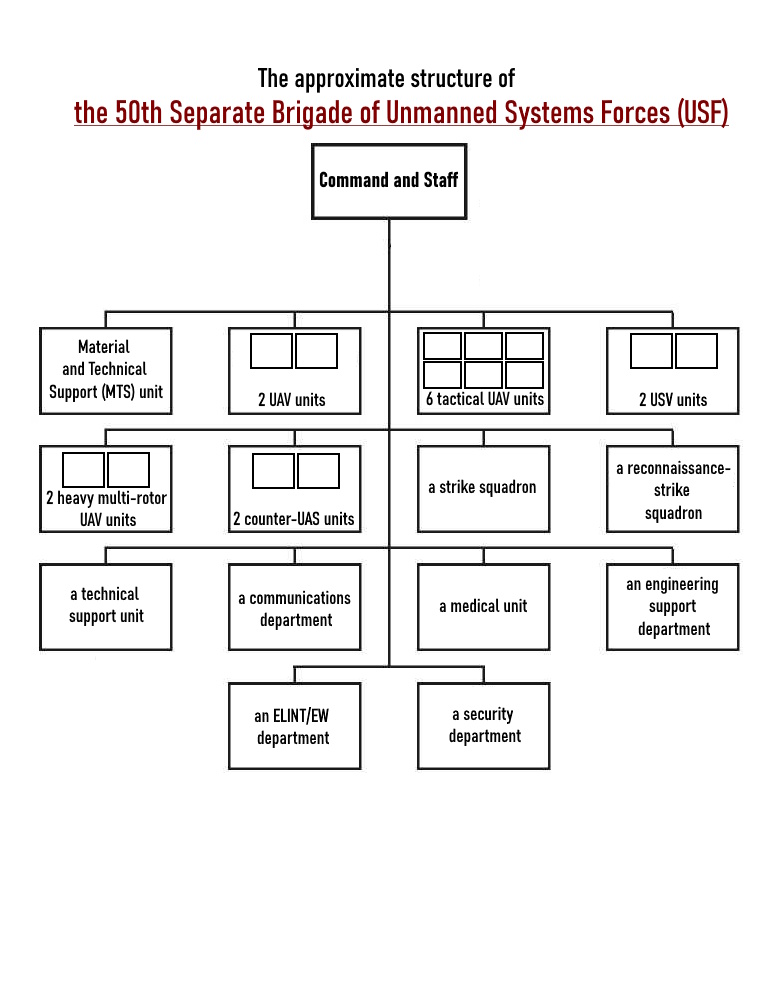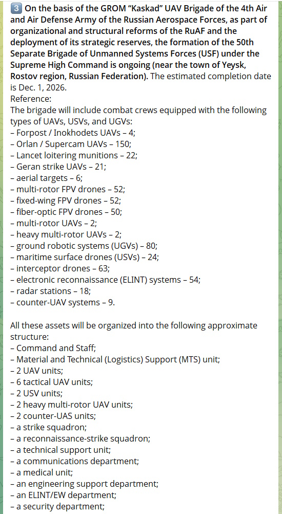 Russia is forming the 50th Brigade of Unmanned Systems Forces, to serve as a high-tempo, multi-domain unmanned warfare unit under Supreme High Command, integrating 500+ UAVs, USVs, UGVs, and EW systems across 15 specialized units for reconnaissance, strike, and counter-UAS ops.