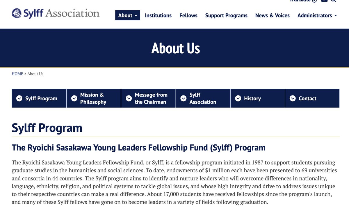 SPF's fellowship program SYLFF (Ryoichi Sasakawa Young Leaders Fellowship Fund) has put $1 million endowments into 69 universities in 44 countries since 1987.