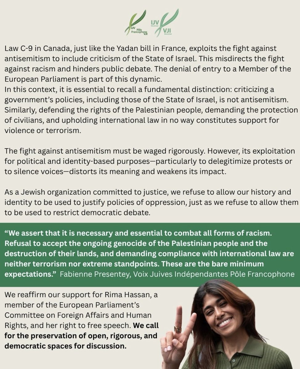 3/3 En tant qu'organisation juive engagée pour la justice, nous refusons que notre histoire et notre identité soient mobilisées pour justifier des politiques d'oppression, comme nous refusons qu'elles servent à restreindre le débat démocratique. Nous réaffirmons notre soutien à Rima