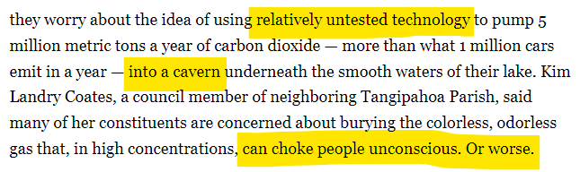 "Can choke people unconscious. Or worse" is, I suppose this is literally true but given the safety record of CO2 storage and the regulatory regime associated with injection, highly highly unlikely.