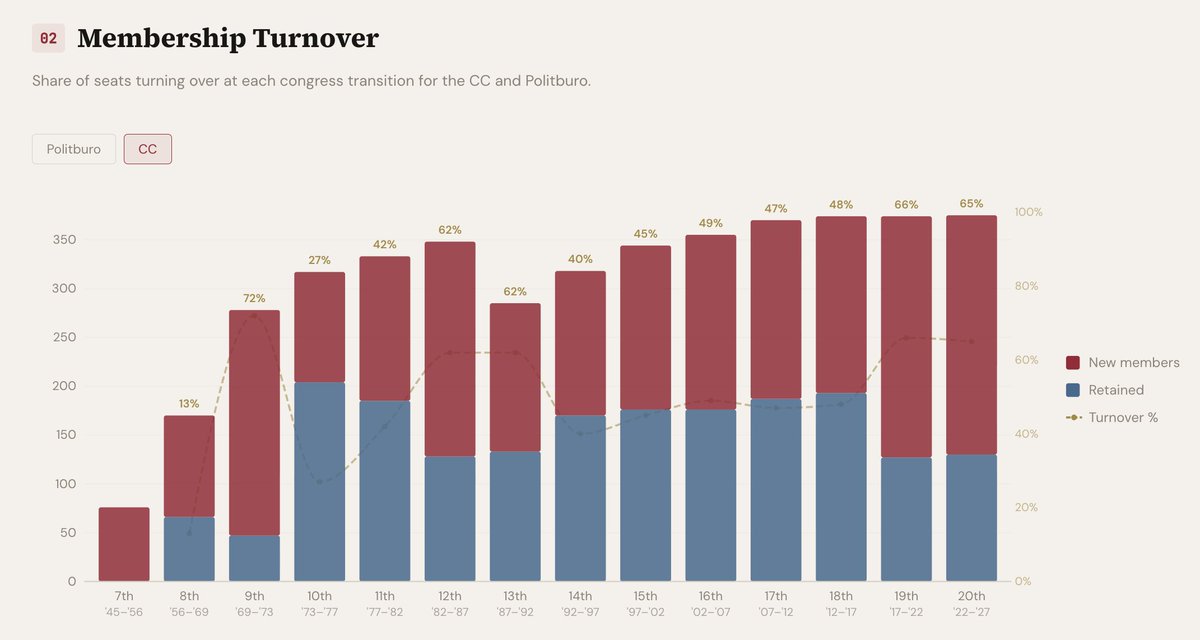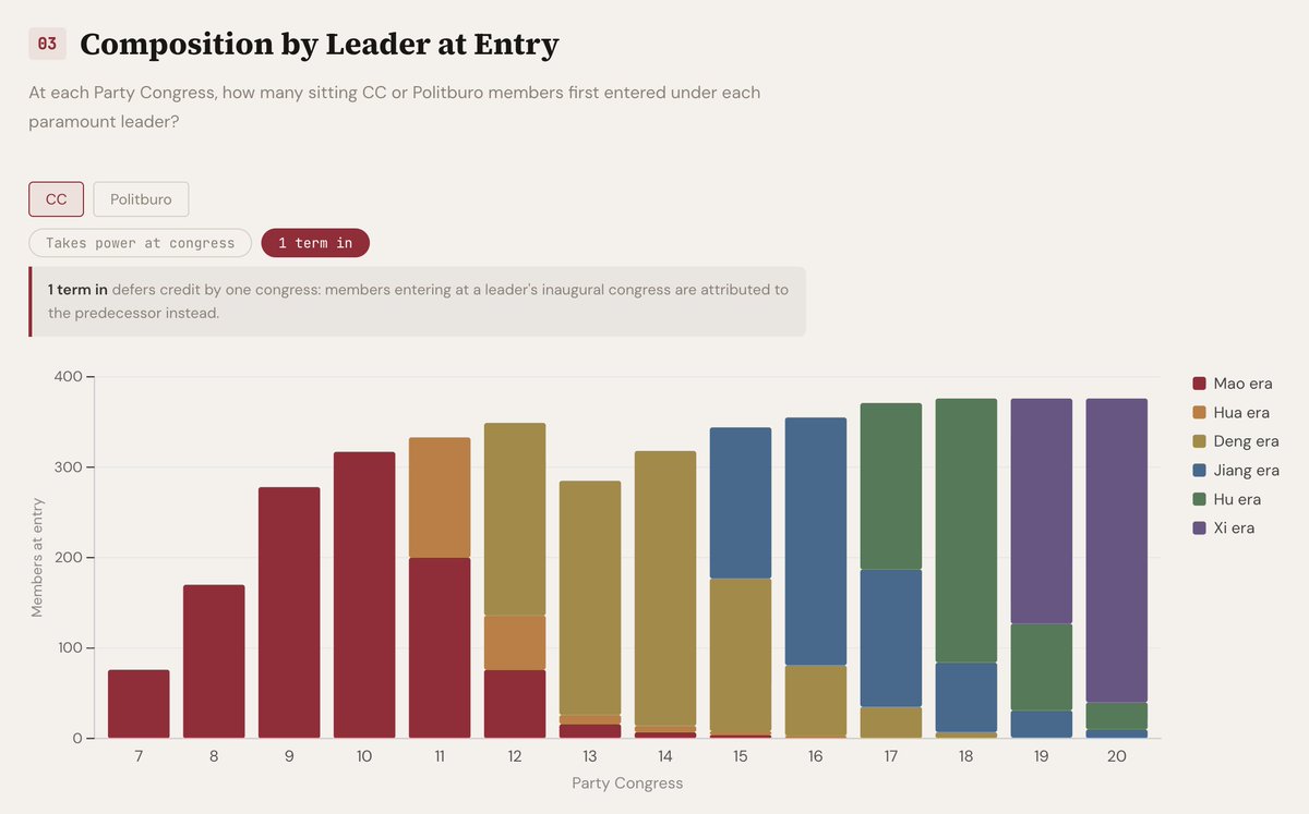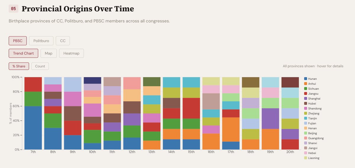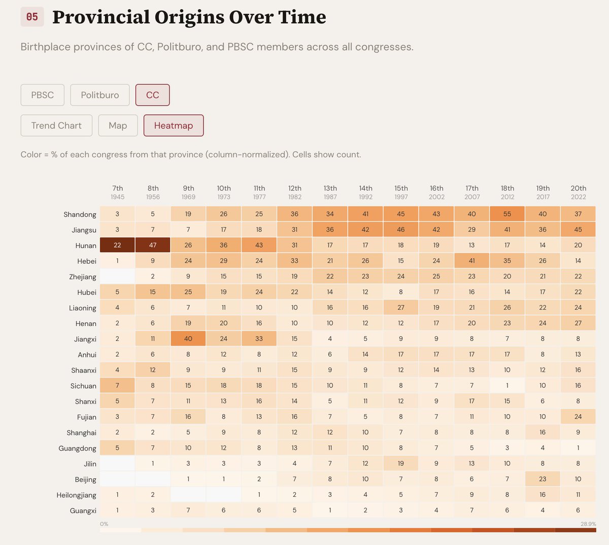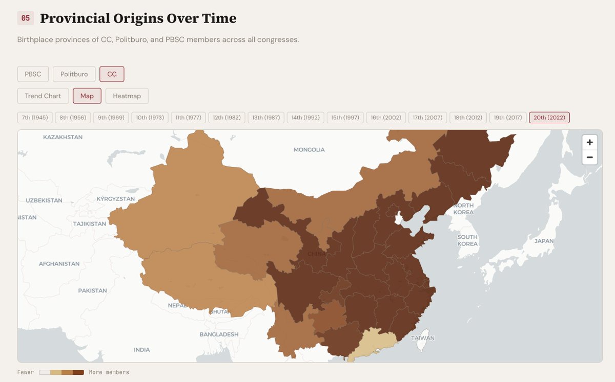An open source website on the Chinese Communist Party elite, with data visualizations. Every Central Committee (4,324), Politburo (168), and PBSC member from 1945–Present.
