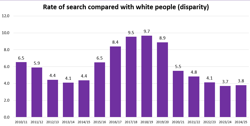 So, is this progress towards race equity in the use of police powers? I would say yes and no. Yes, because calculated disproportionality has fallen. No, because key drivers of that have almost certainly been using updated Census data and changes to knife violence (esp in London).