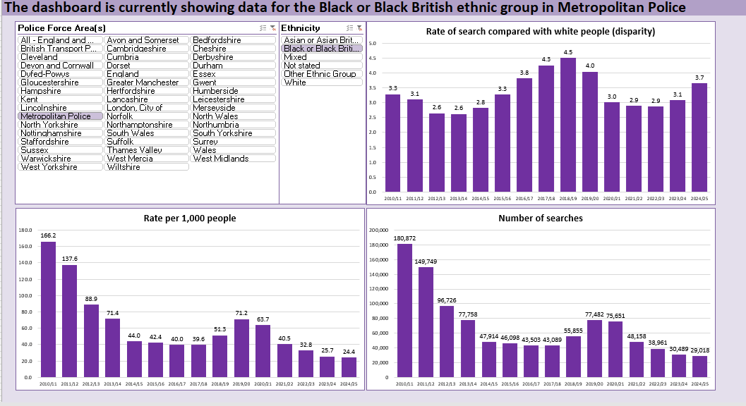 Handily, the Home Office publishes an 'ethnic disparities time series dashboard' for stop and search. Here's Greater Manchester Police. Note how in the top R chart black/white disparity increases to a cliff edge after 2019/20. #stopsearch assets.publishing.service.gov.uk/media/66f44156…